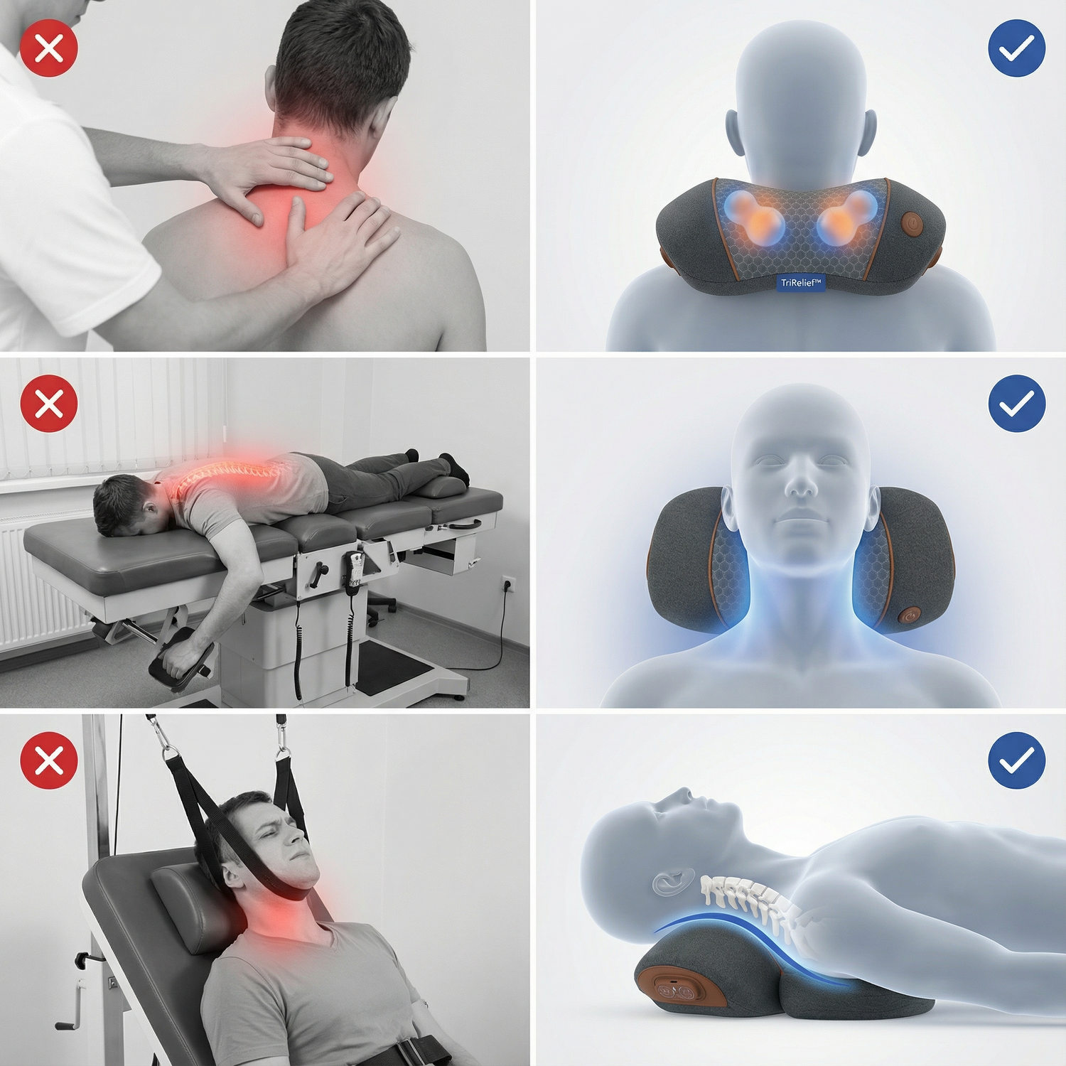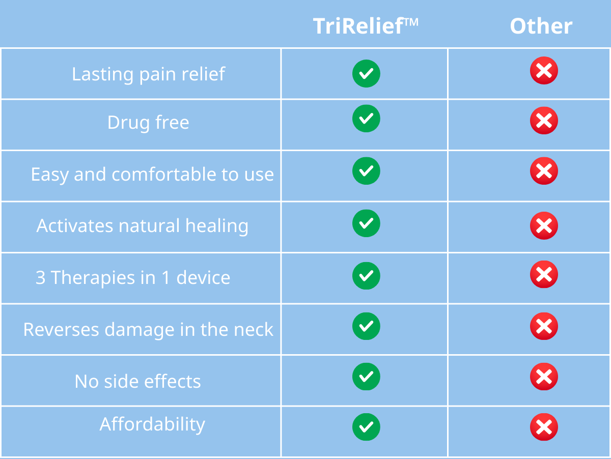 Unlike other neck devices that can be too powerful or even dangerous, TriRelief™ is designed with your safety and comfort in mind.Its memory foam construction ensures a gentle, secure fit, providing optimal support without causing discomfort or harm to your neck.Many devices on the market can be overly intense, leading to muscle strain or injury, but TriRelief™ allows you to easily control the intensity of both the massage and heat, so you can find the perfect setting for your needs.Simply select the desired intensity, relax, and let the device work for just 15 minutes. With TriRelief™, you get the relief you need without the risks—making it the safe, comfortable, and effective solution for neck pain.